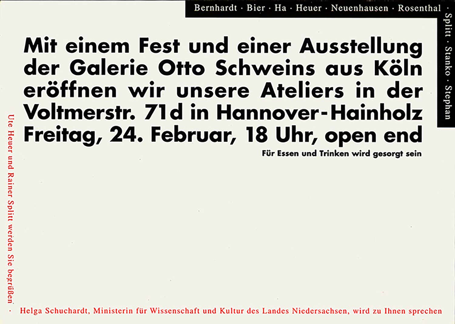 Nach der Gründung des „Atelierhaus .e.V.“ 1993 folgten zwei Jahre Planung und Umbau, bevor die Künstler*innen am 24. Februar 1995 die Räume erstmals der Öffentlichkeit präsentierten. Im Rahmen des Rundgangs durch die neuen Ateliers zeigte die Galerie Otto Schweins aus Köln auf Einladung des Atelierhauses einen Querschnitt durch ihr Programm.