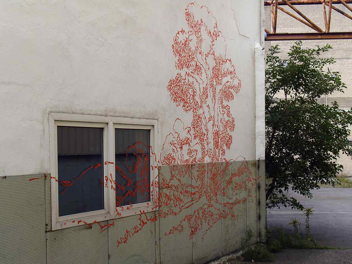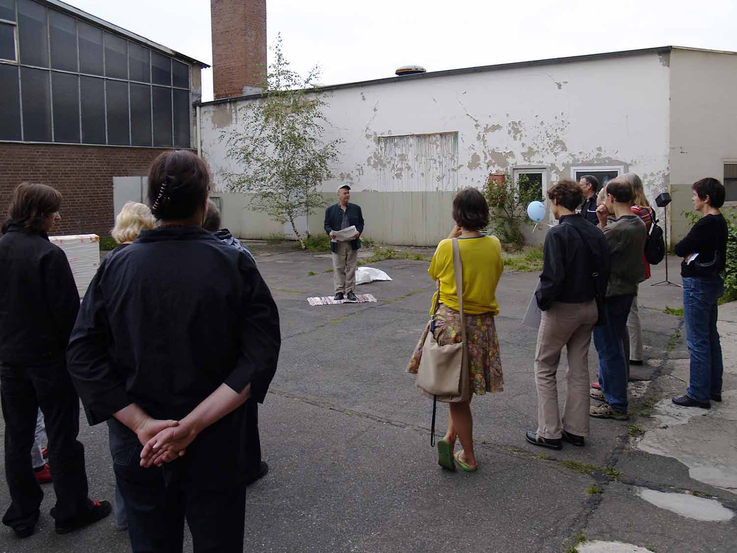 Für die Ausstellung „New Fabric“ wurde erstmalig ausschließlich der Innenhof des Atelierhauses als Ausstellungsfläche genutzt, und das auch zum einzigen Mal: Mit der Präsentation reagierten die Künstler*innen auf den bevorstehenden Abriss der umliegenden Fabrikbebauung, der die Vorzüge eines vielseitig genutzten, geschützten Hinterhofes schlagartig zunichte machte.