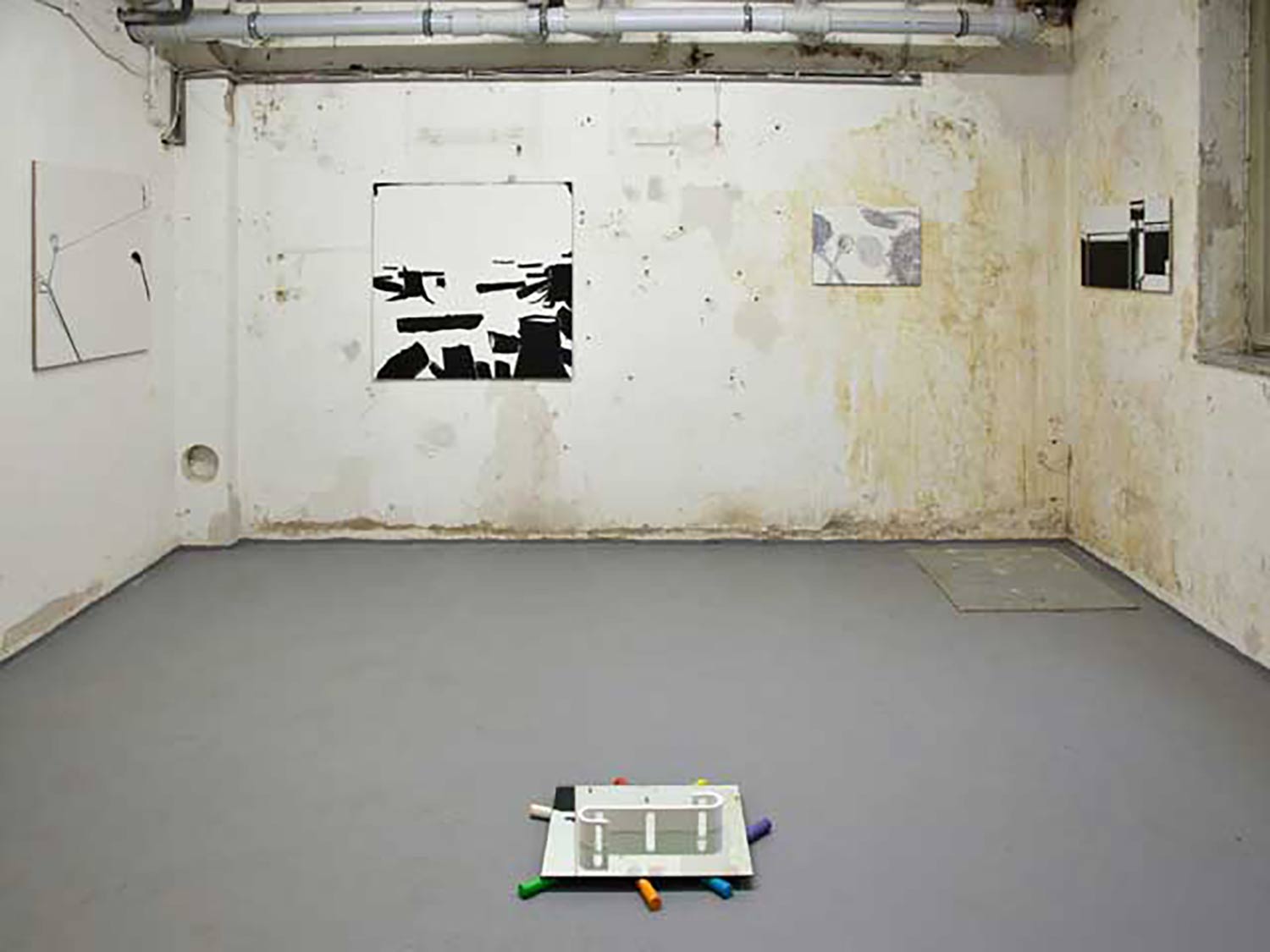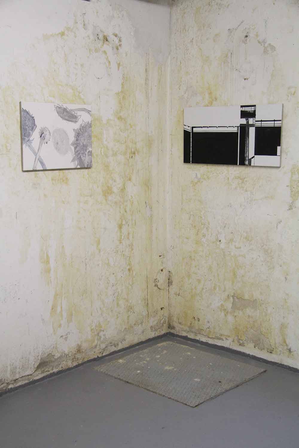 Einen leeren Raum mit unrenovierten fleckigen Wänden, der in dem niedrigen Keller ab jetzt als Lager genutzt werden soll, nutzte Rolf Bier zur Präsentation einer Auswahl thematisch und motivisch zusammengehöriger Bilder aus den Jahren 2000 - 2002, die in Berlin entstanden waren. Dabei trat die grafisch pointierte Malerei in kontrastreichen Dialog mit dem gelblichen Teint der verbrauchten, bröckelnden Wände.
