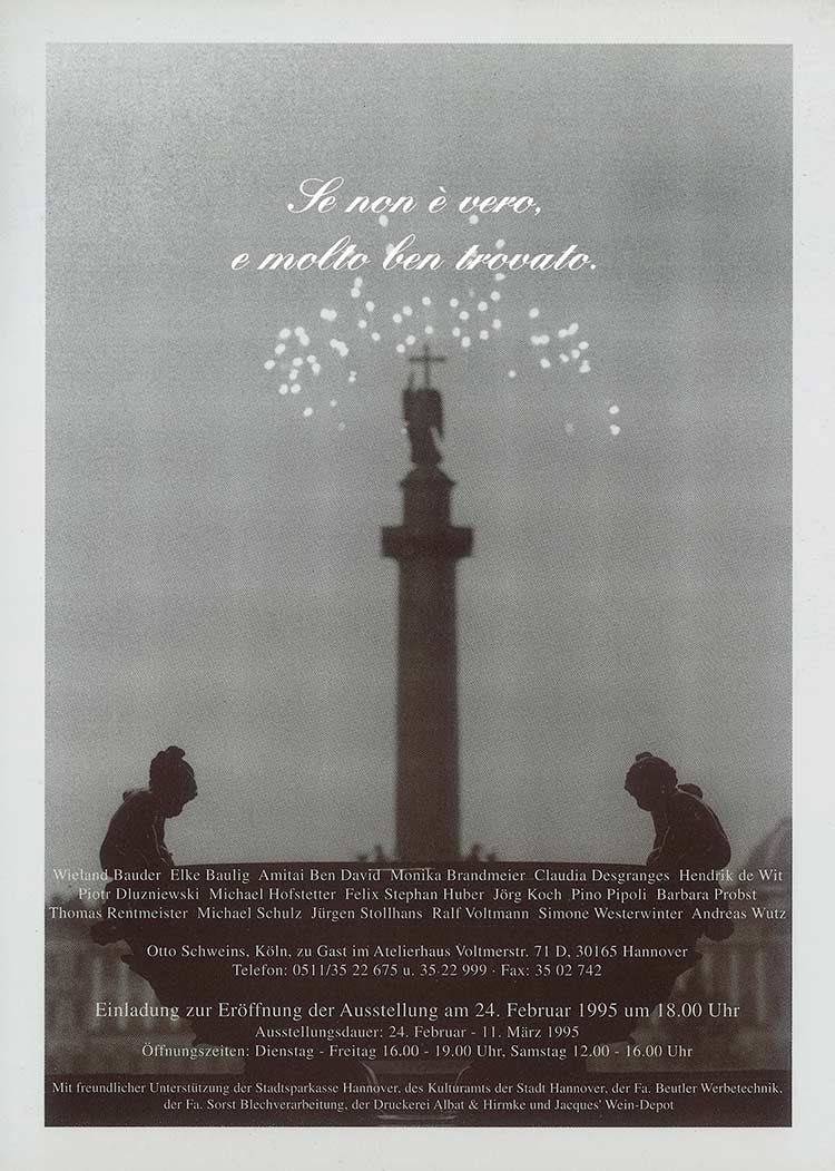 Nach der Gründung des „Atelierhaus .e.V.“ 1993 folgten zwei Jahre Planung und Umbau, bevor die Künstler*innen am 24. Februar 1995 die Räume erstmals der Öffentlichkeit präsentierten. Im Rahmen des Rundgangs durch die neuen Ateliers zeigte die Galerie Otto Schweins aus Köln auf Einladung des Atelierhauses einen Querschnitt durch ihr Programm.