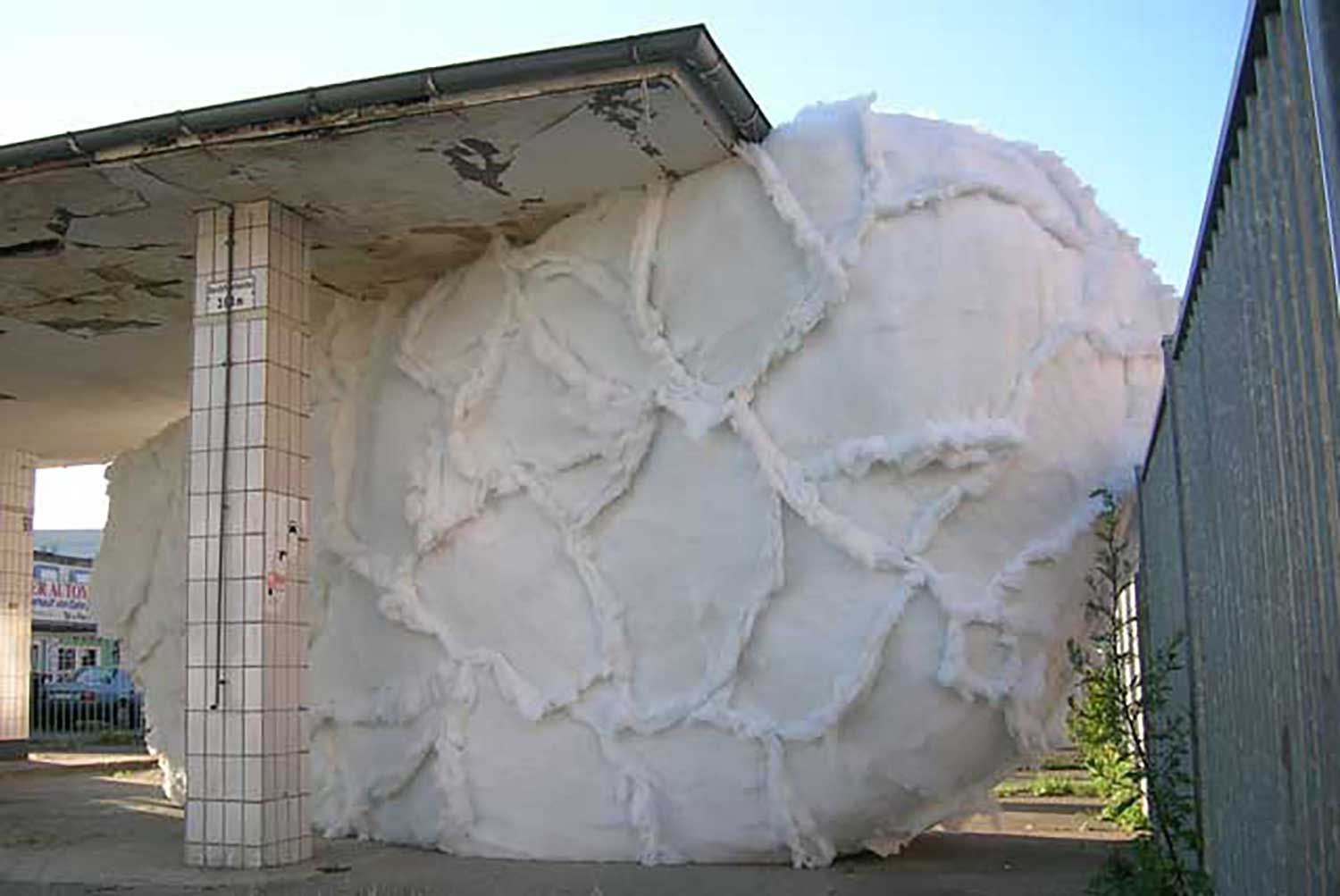 Andrea v.Lüdinghausen setzte einen großen weichen Körper in den Zwischenraum zwischen Tankstellendach, -boden und einem martialischen Zaun, der, mit scharfen Stahlspitzen bewehrt, mehr als deutlich die Grenze zwischen privat und öffentlich markiert. Das große weiße Objekt aus Füllwatte schien sich aus dem Raum unter dem Dach in Richtung Straße und davor liegender Straßenbahnhaltestelle herauszuquetschen und versah die gesamte Situation mit einem paradoxen Moment.